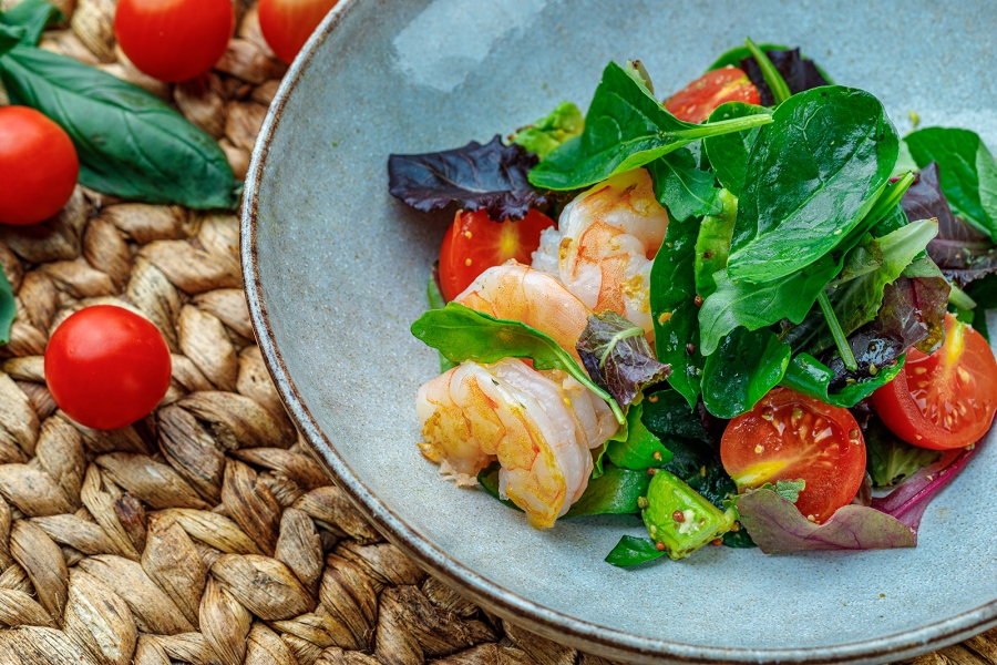 (avocado, prawns, lemon sauce, Cherry tomato).