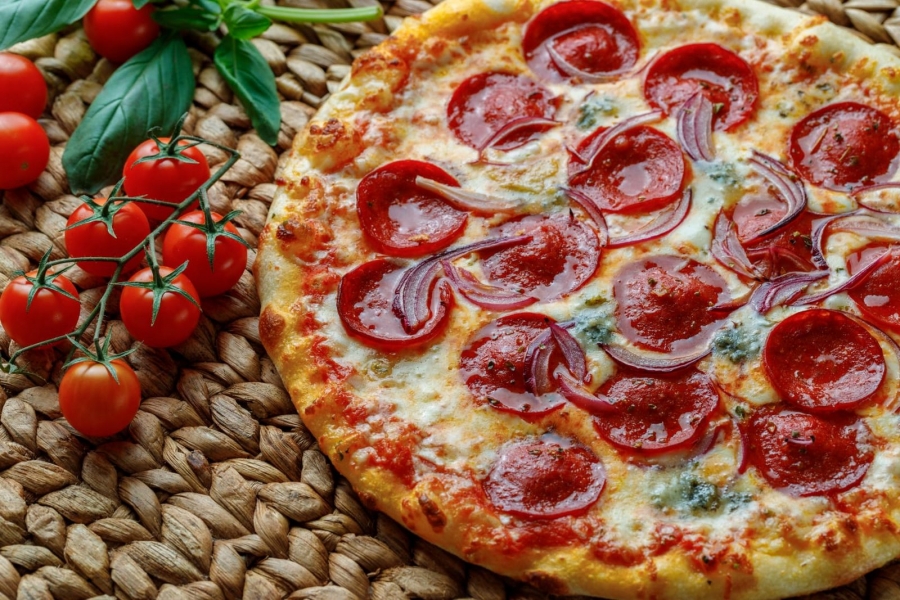 (tomato sauce, mozzarella, spicy salami, red onion, spicy pepper).